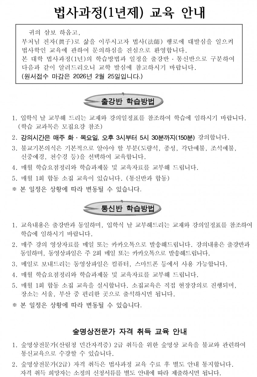 법사과정 교육안내 페이지 정보 작성자 한국불교법사대학 댓글 0건 조회 150회 작성일 26-01-05 14:40 본문 목록 이전글법사과정 등록안내 26.01.05 다음글2026학년도 1월~2월 일정 25.12.29 댓글목록 댓글목록 등록된 댓글이 없습니다.